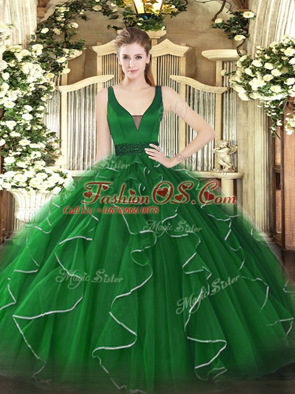 Custom Designed Sleeveless Floor Length Beading and Ruffles Zipper 15th Birthday Dress with Green
