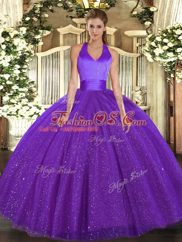 Sophisticated Purple Tulle Lace Up Ball Gown Prom Dress Sleeveless Floor Length Sequins
