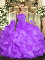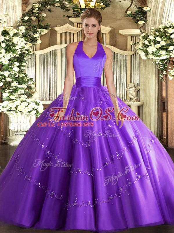 Purple Tulle Lace Up Halter Top Sleeveless Floor Length Sweet 16 Quinceanera Dress Appliques