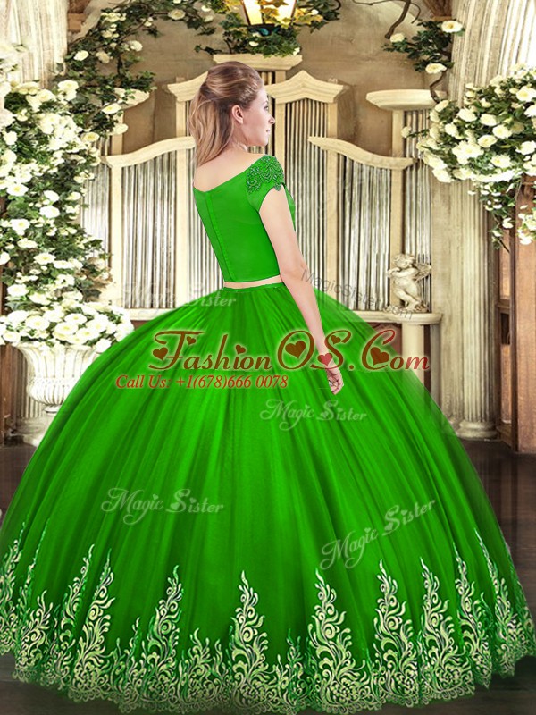 Discount Teal Two Pieces Off The Shoulder Short Sleeves Tulle Floor Length Zipper Appliques Vestidos de Quinceanera