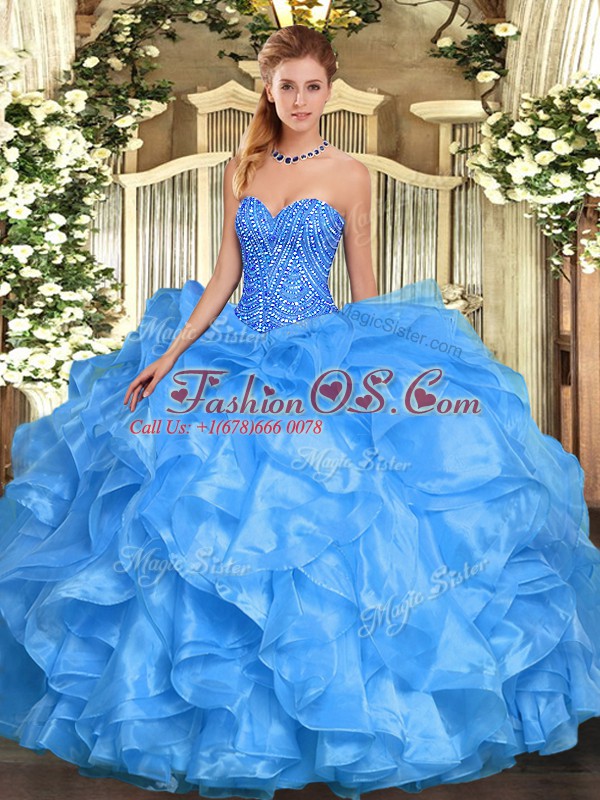 Sweetheart Sleeveless Quince Ball Gowns Floor Length Beading and Ruffles Baby Blue Organza