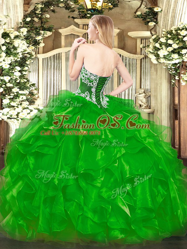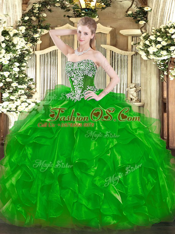 Green Lace Up Strapless Beading and Ruffles Vestidos de Quinceanera Organza Sleeveless