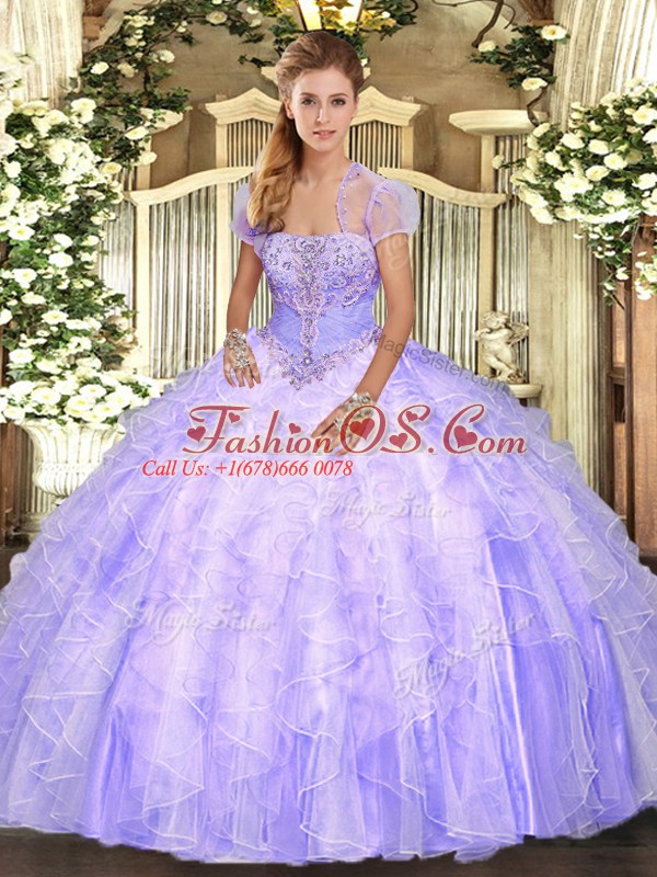 High End Lavender Ball Gowns Appliques and Ruffles Quinceanera Gowns Lace Up Tulle Sleeveless Floor Length