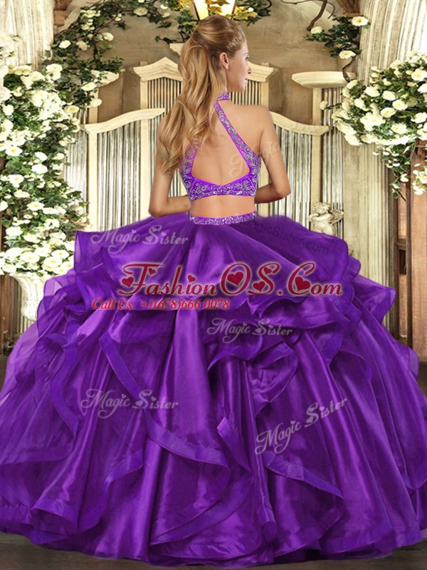 Purple Halter Top Neckline Beading and Ruffled Layers 15th Birthday Dress Sleeveless Criss Cross