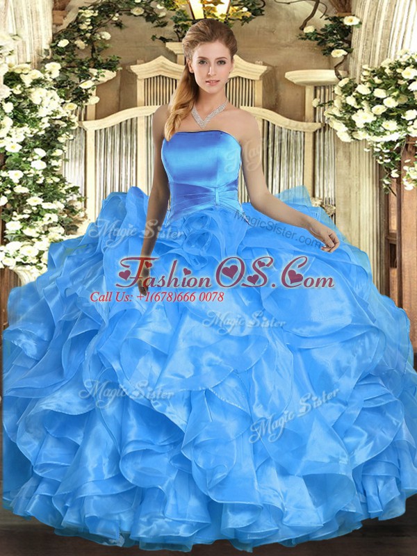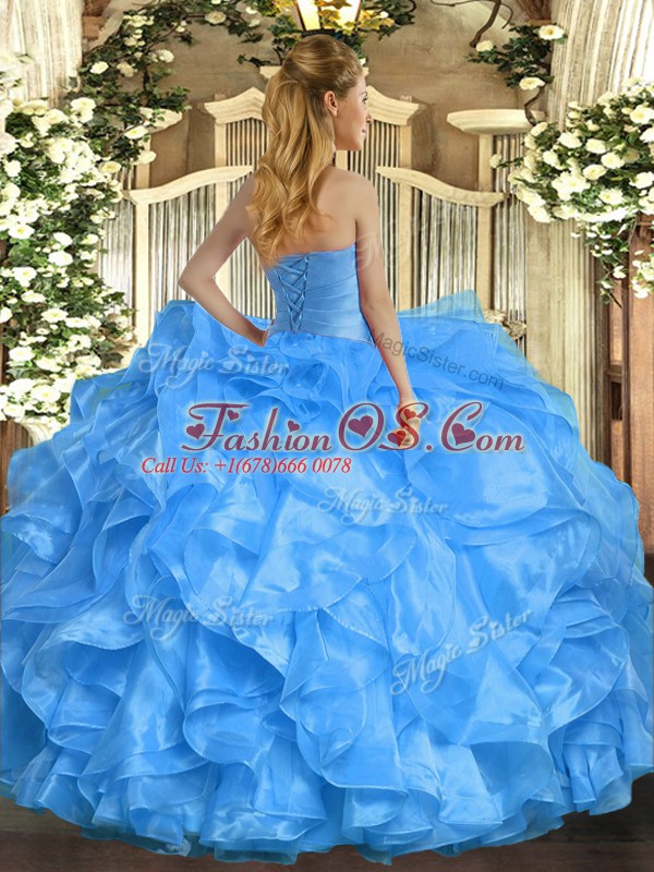 Decent Baby Blue Ball Gowns Organza Strapless Sleeveless Ruffles Floor Length Lace Up Sweet 16 Dress