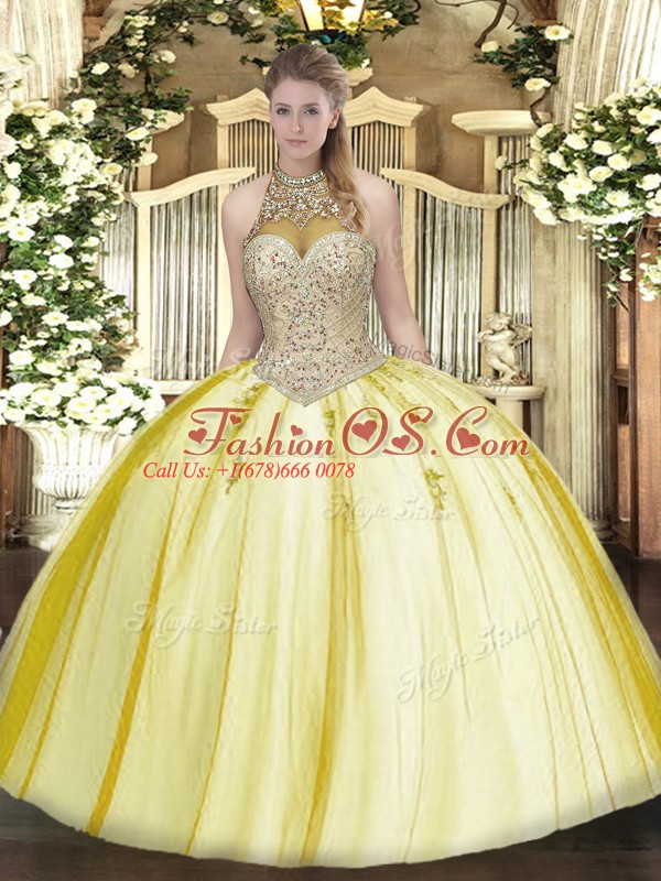 Floor Length Ball Gowns Sleeveless Yellow Quinceanera Gowns Lace Up