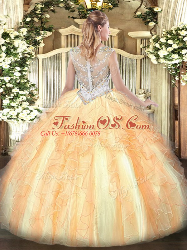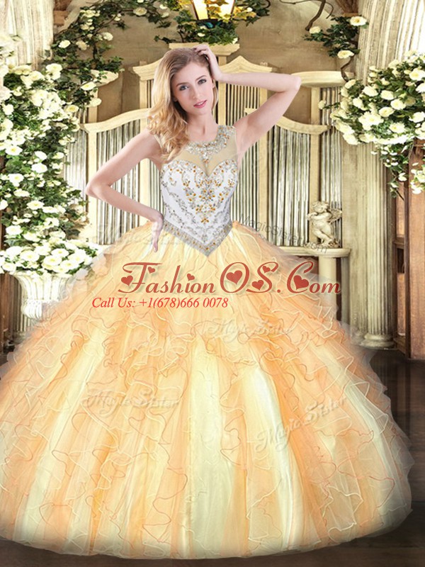 Floor Length Zipper Quinceanera Dresses Gold for Military Ball and Sweet 16 and Quinceanera with Beading and Ruffles