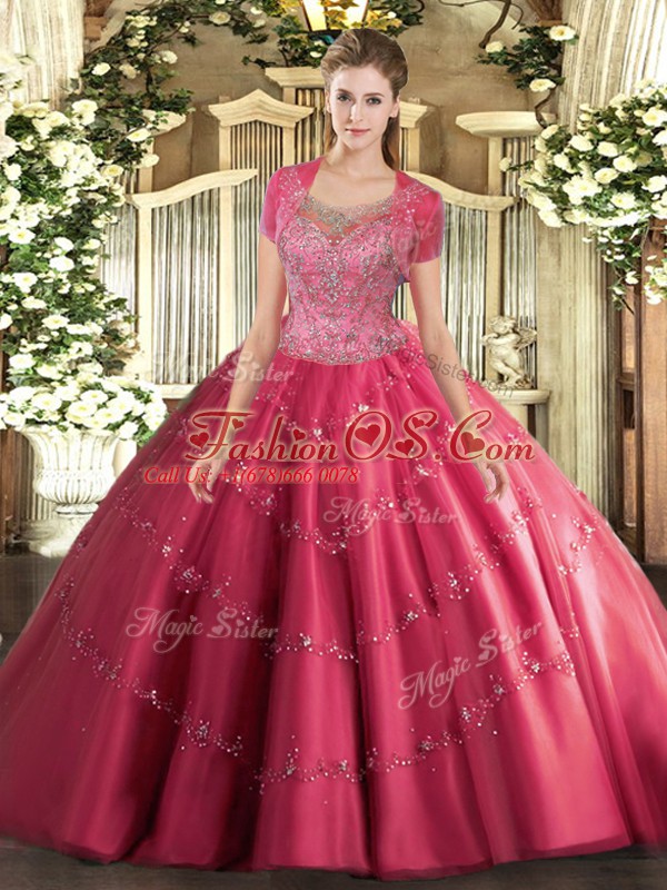 On Sale Sleeveless Tulle Floor Length Clasp Handle 15 Quinceanera Dress in Hot Pink with Beading and Appliques