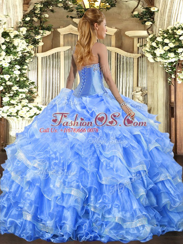 Top Selling Blue Lace Up Sweetheart Beading and Ruffled Layers Quince Ball Gowns Organza Sleeveless