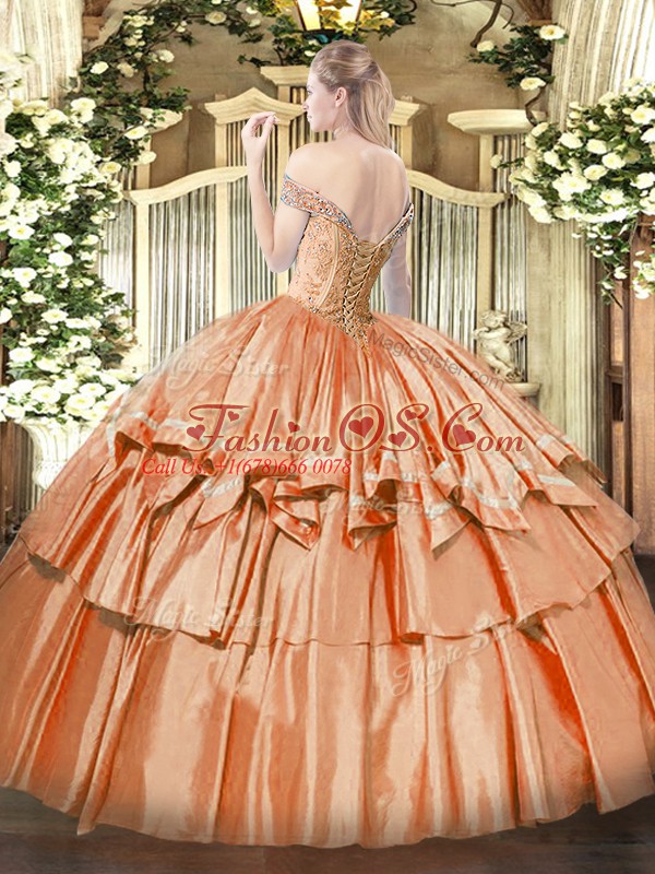 Pretty Gold Lace Up Off The Shoulder Beading and Ruffled Layers Sweet 16 Dresses Organza and Taffeta Sleeveless