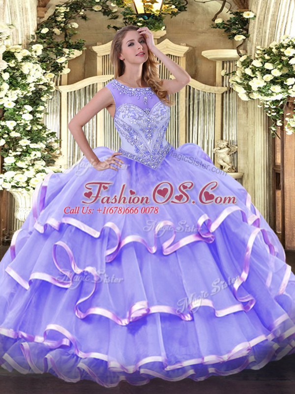 High Quality Floor Length Lavender Quinceanera Gowns Organza Sleeveless Beading and Ruffled Layers