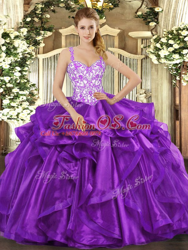 Fitting Eggplant Purple Ball Gowns Organza Straps Sleeveless Beading and Appliques and Ruffles Floor Length Lace Up Sweet 16 Dress