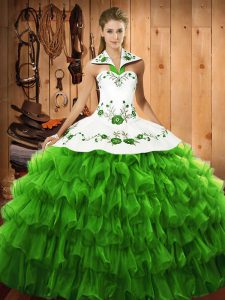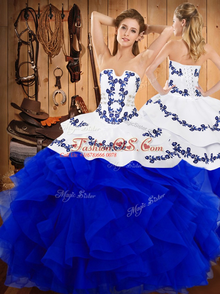 Superior Blue Ball Gowns Embroidery and Ruffles Ball Gown Prom Dress Lace Up Satin and Organza Sleeveless Floor Length