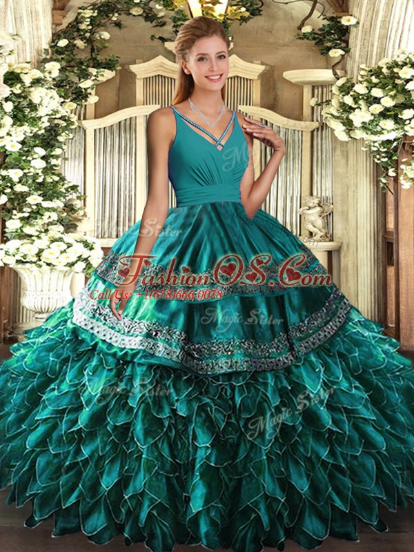 Great Sleeveless Zipper Floor Length Beading and Ruffles 15th Birthday Dress