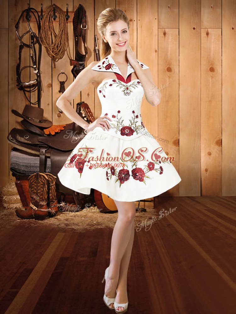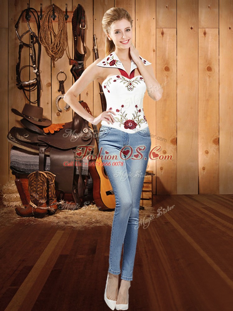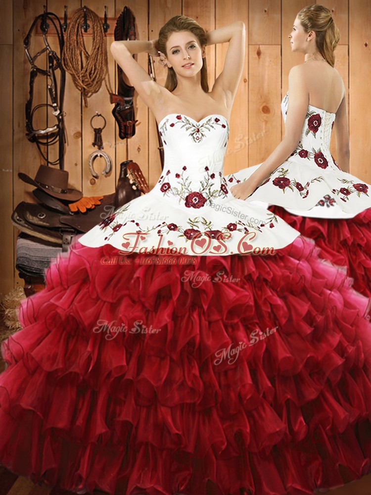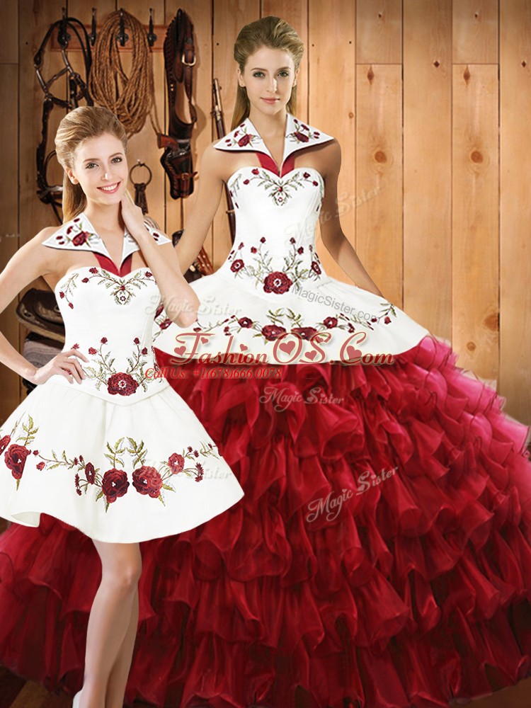 Gorgeous Organza Halter Top Sleeveless Lace Up Embroidery and Ruffled Layers Sweet 16 Quinceanera Dress in Wine Red