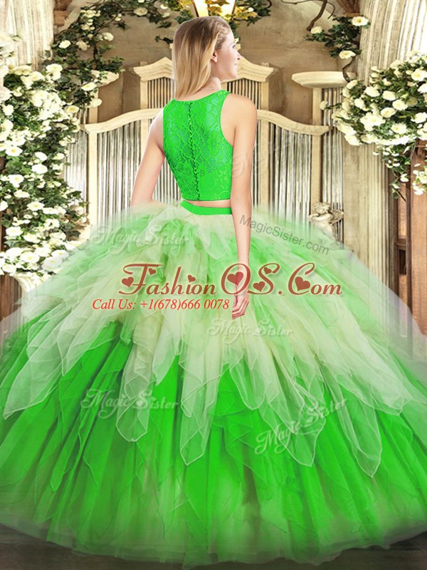 Flare Sleeveless Floor Length Lace and Ruffles Zipper Quinceanera Gown with Yellow Green