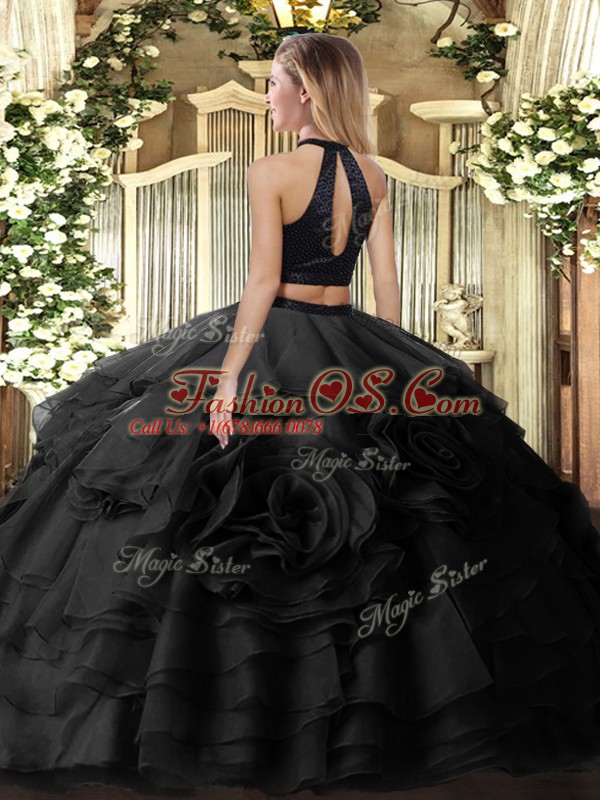 Best Selling Halter Top Sleeveless 15 Quinceanera Dress Floor Length Beading and Ruffles Rust Red Tulle