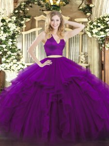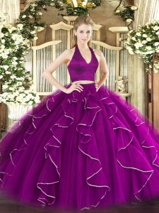 Floor Length Orange Red Quinceanera Gown Halter Top Sleeveless Lace Up