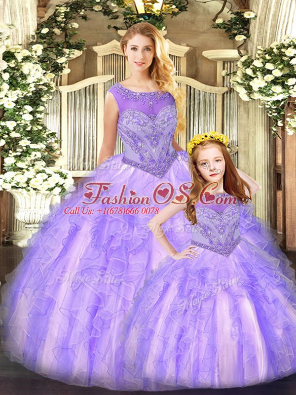Lavender Lace Up Scoop Beading and Ruffles Ball Gown Prom Dress Organza Sleeveless