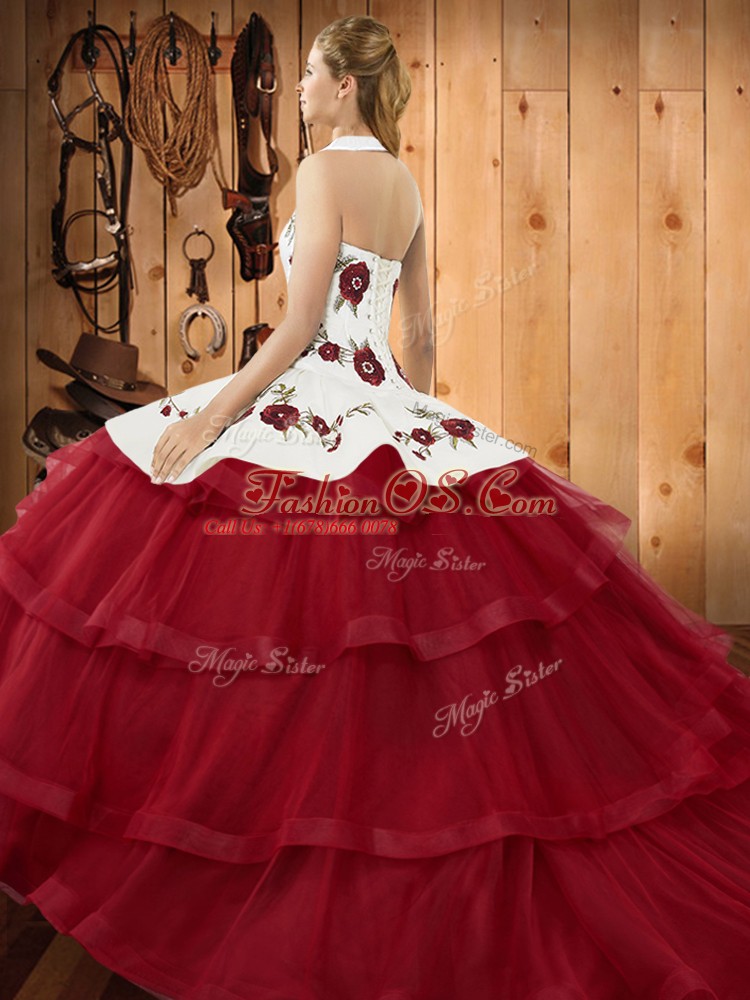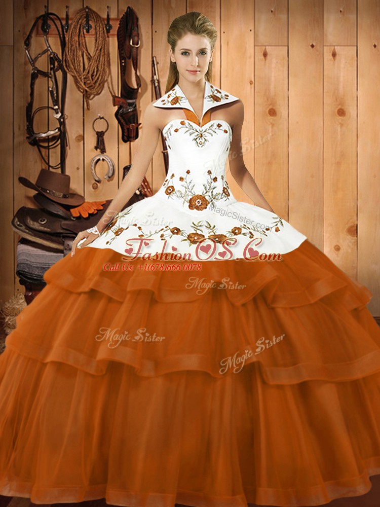 Halter Top Sleeveless Brush Train Lace Up Quince Ball Gowns Rust Red Satin and Organza