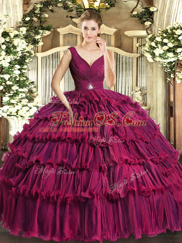 Floor Length Backless Quinceanera Dresses Fuchsia for Sweet 16 and Quinceanera with Beading and Ruffled Layers