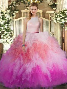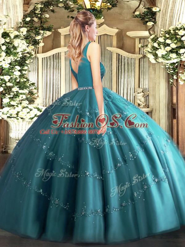 Wine Red Ball Gowns V-neck Sleeveless Tulle Floor Length Zipper Beading Sweet 16 Dress