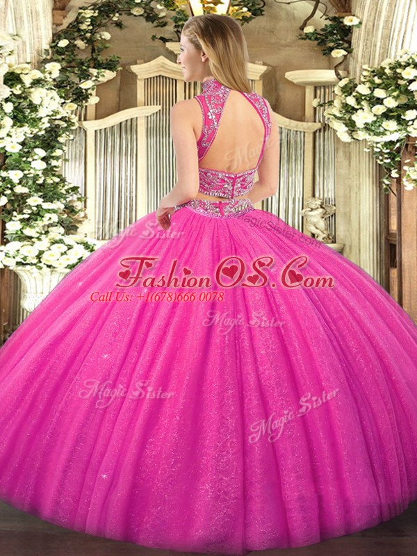 Lavender Tulle Backless High-neck Sleeveless Floor Length Quinceanera Dress Beading