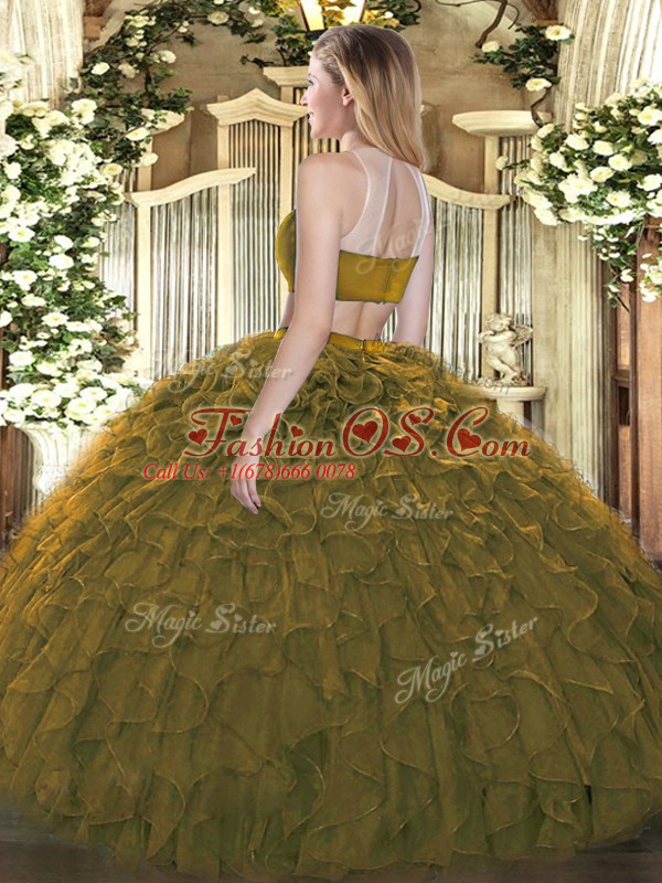 Tulle High-neck Sleeveless Backless Beading and Ruffles Sweet 16 Dress in Olive Green