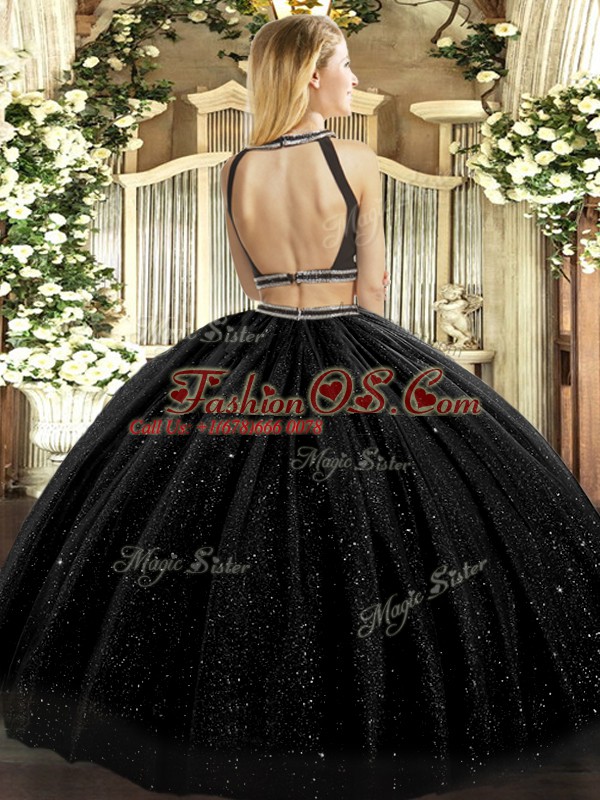 Black Two Pieces Ruching Sweet 16 Dresses Backless Tulle Sleeveless Floor Length