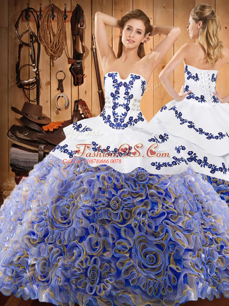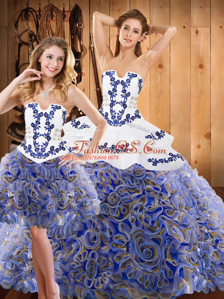 Sweep Train Three Pieces Sweet 16 Dresses Multi-color Strapless Satin and Fabric With Rolling Flowers Sleeveless With Train Lace Up