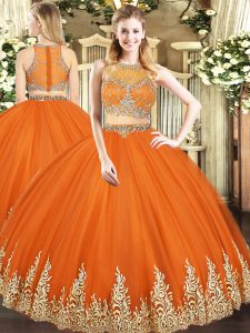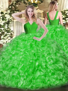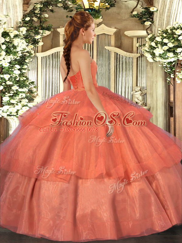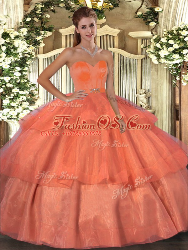 Perfect Sleeveless Organza Floor Length Lace Up Quinceanera Gowns in Orange Red with Beading and Ruffled Layers