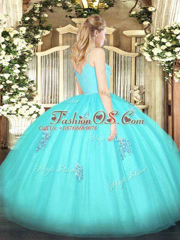 Luxury Spaghetti Straps Sleeveless 15th Birthday Dress Floor Length Appliques Yellow Tulle