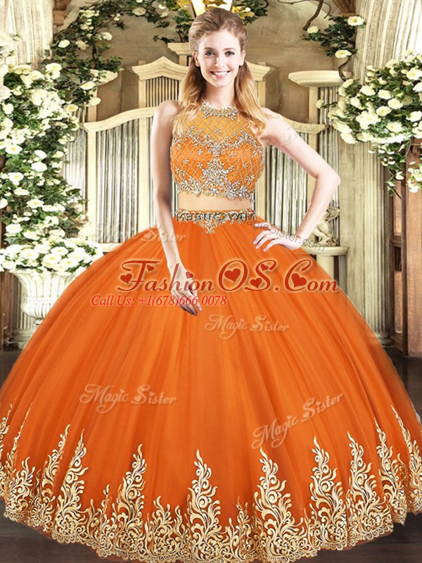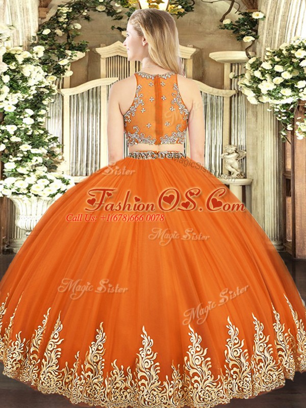 Charming Sleeveless Tulle Floor Length Zipper Sweet 16 Dress in Orange Red with Beading and Appliques