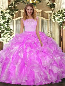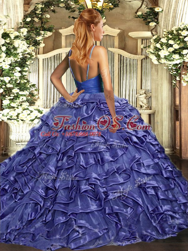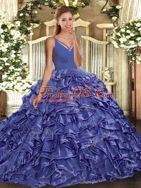 Noble Floor Length Backless Ball Gown Prom Dress Lavender for Sweet 16 and Quinceanera with Beading and Ruffles