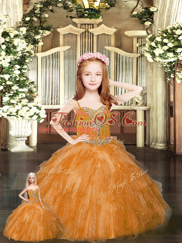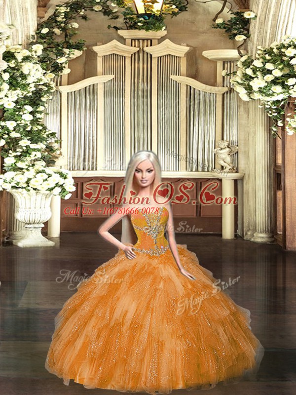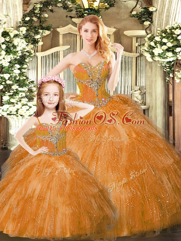 Floor Length Lace Up Quinceanera Gown Rust Red for Military Ball and Sweet 16 and Quinceanera with Beading and Ruffles