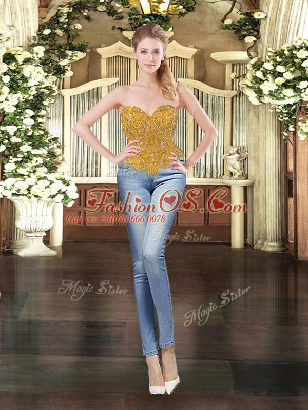 Stunning Sleeveless Tulle Floor Length Lace Up Ball Gown Prom Dress in Gold with Beading and Appliques