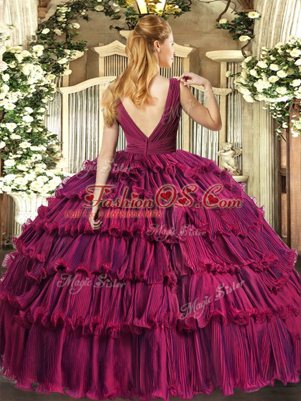 Purple Ball Gowns V-neck Sleeveless Organza Floor Length Backless Beading and Ruffled Layers Quinceanera Gowns