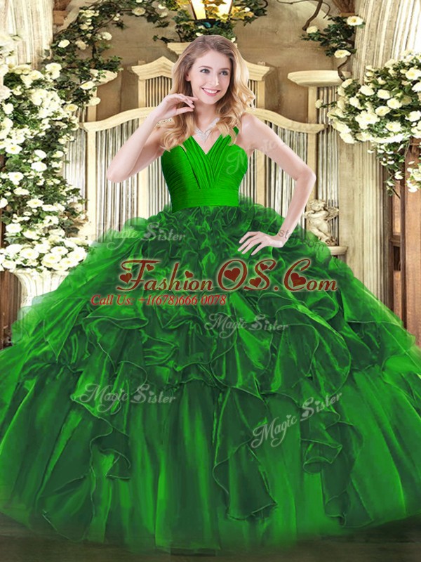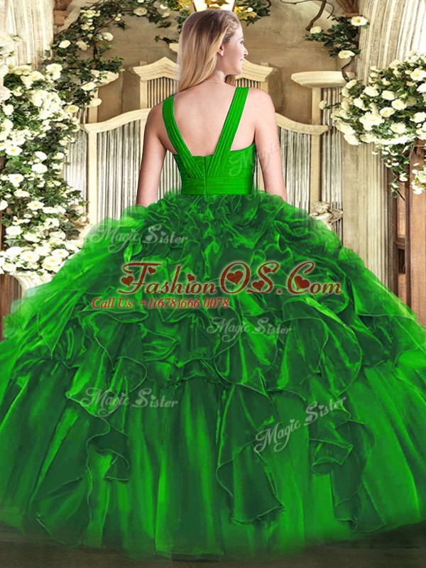 Low Price Floor Length Dark Green 15th Birthday Dress Organza Sleeveless Ruffles