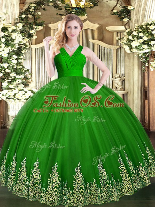 Artistic V-neck Sleeveless Zipper Quinceanera Gown Green Tulle