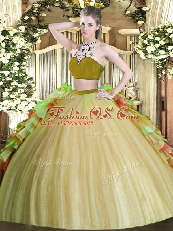 Olive Green Sleeveless Beading and Ruffles Floor Length Quinceanera Gowns