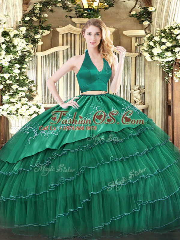 Noble Dark Green Halter Top Zipper Embroidery and Ruffled Layers 15 Quinceanera Dress Sleeveless