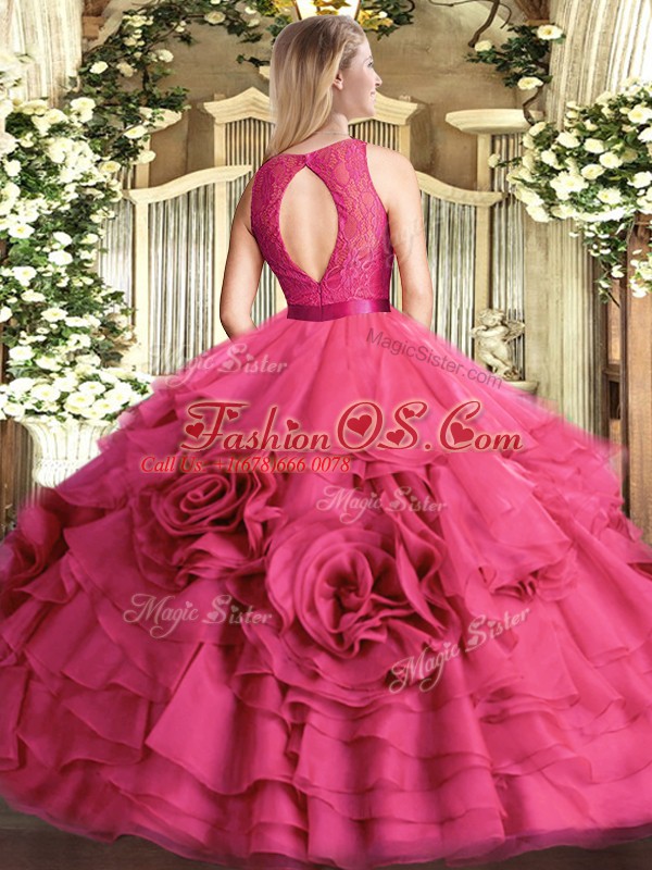 Scoop Sleeveless Zipper Sweet 16 Dress Hot Pink Fabric With Rolling Flowers