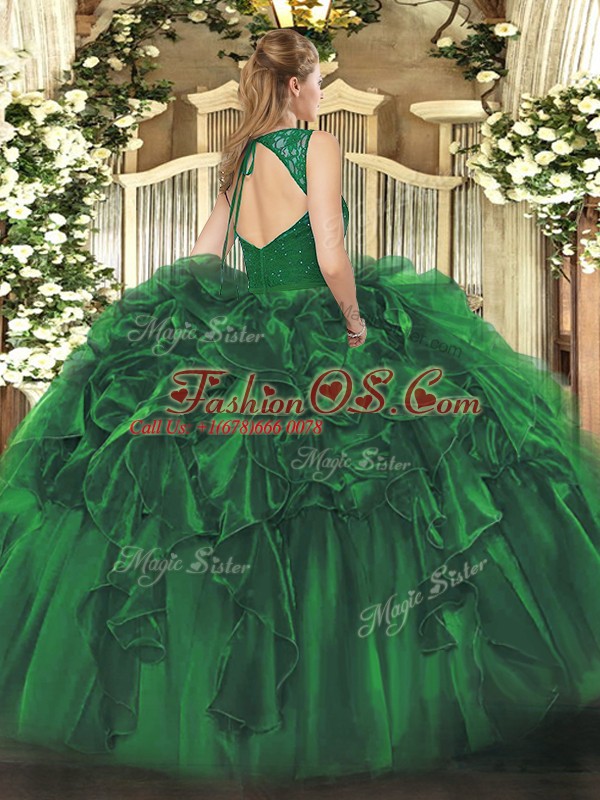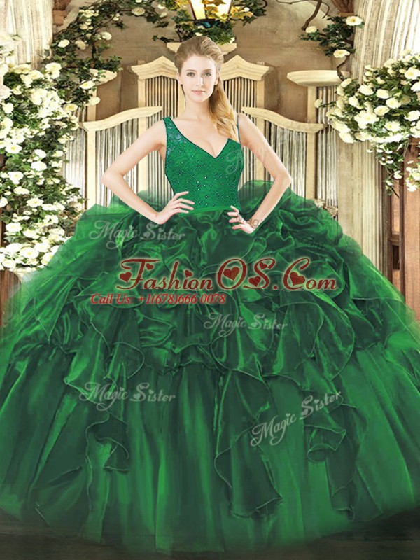 High End V-neck Sleeveless Quinceanera Gowns Floor Length Beading and Ruffles Dark Green Organza