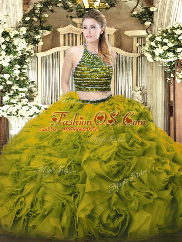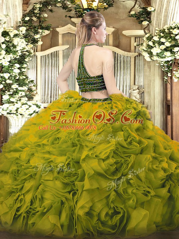 Cheap Halter Top Sleeveless Sweet 16 Quinceanera Dress Floor Length Beading and Ruffles Olive Green Tulle