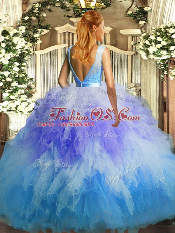 Fine Organza Sleeveless Floor Length Quinceanera Gowns and Lace and Ruffles