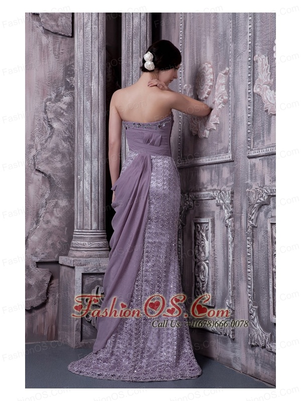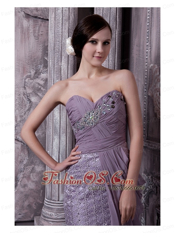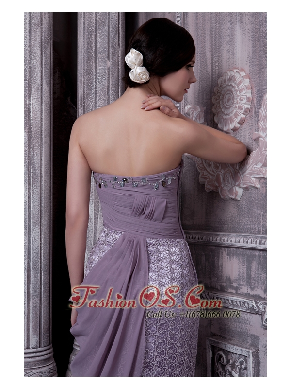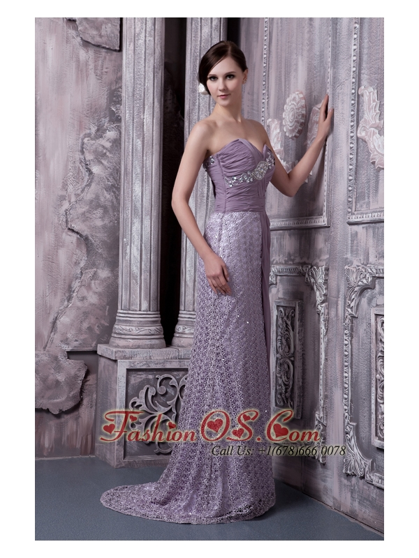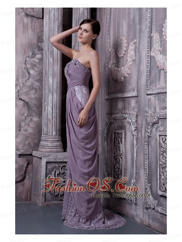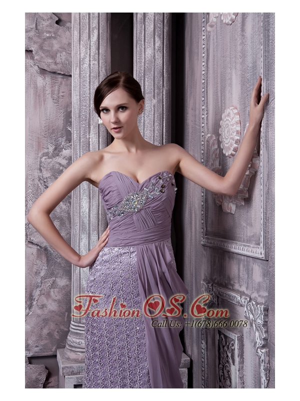 Lavender Column Sweetheart Evening Dress Special Fabric and Chiffon Beading Brush Train
