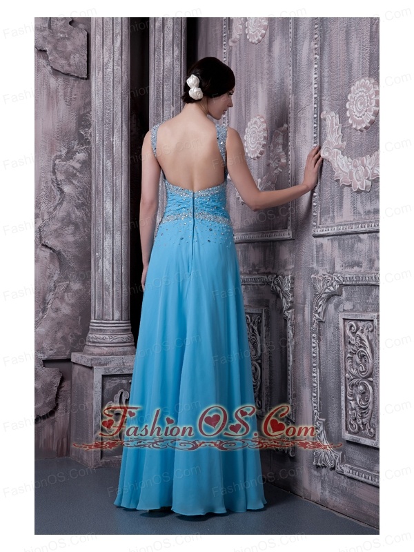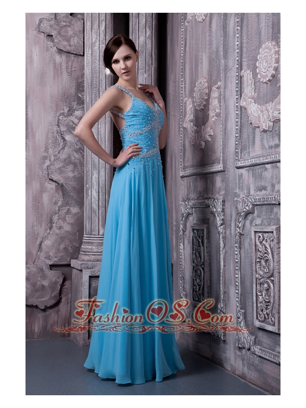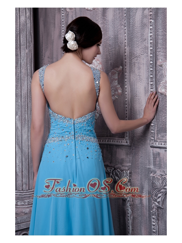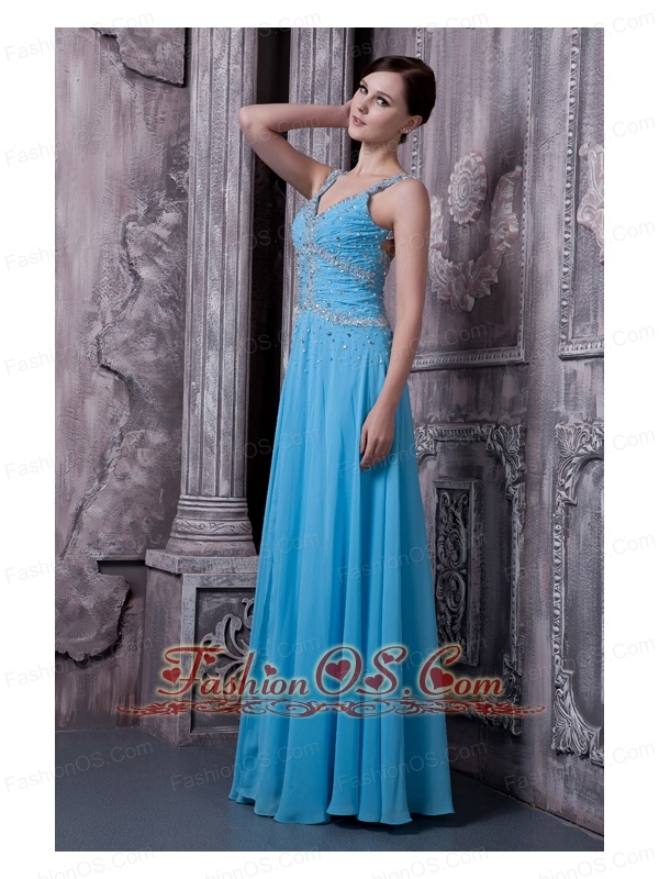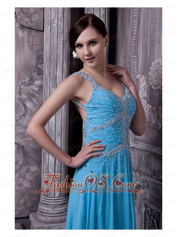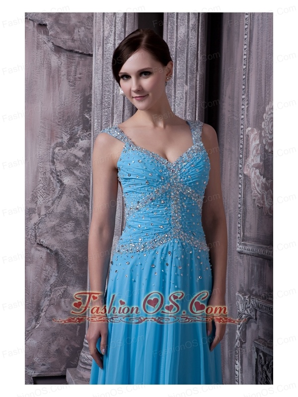 Discount Aqua Blue Evening Dress Empire Straps Chiffon Beading Floor-length