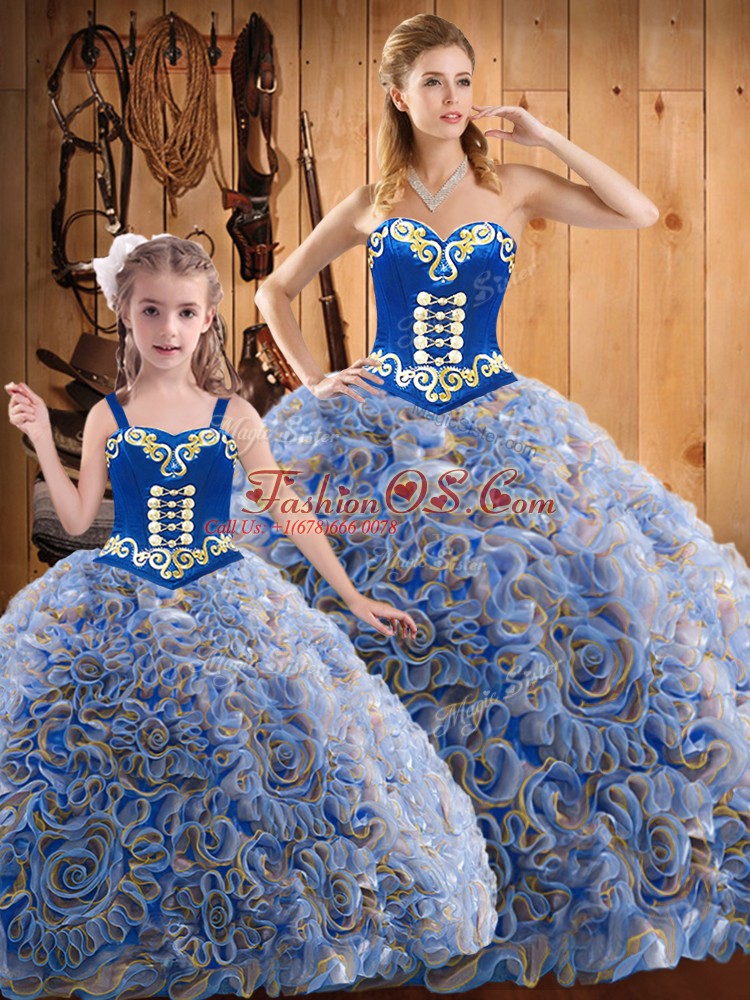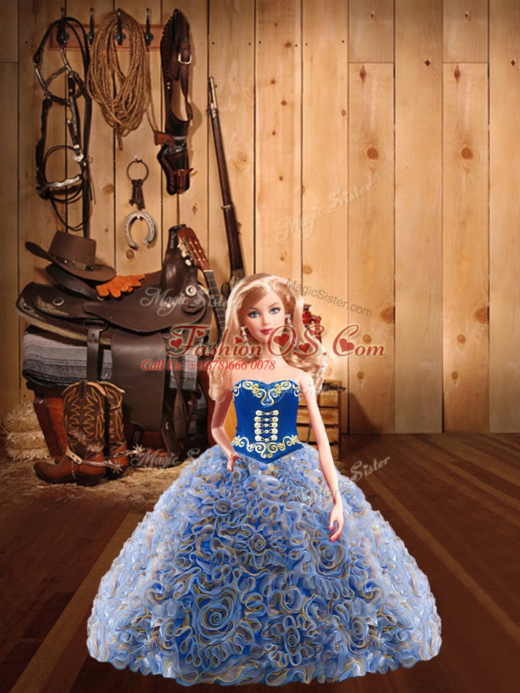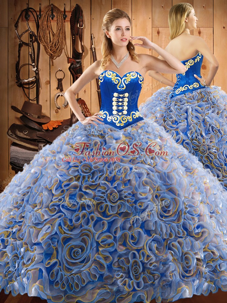 Admirable Multi-color Lace Up Sweetheart Embroidery Ball Gown Prom Dress Fabric With Rolling Flowers Sleeveless Sweep Train