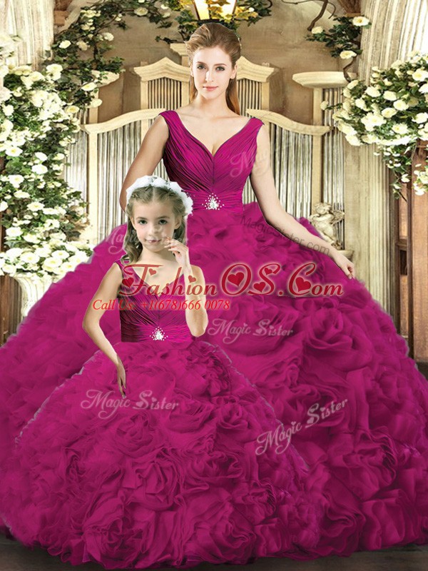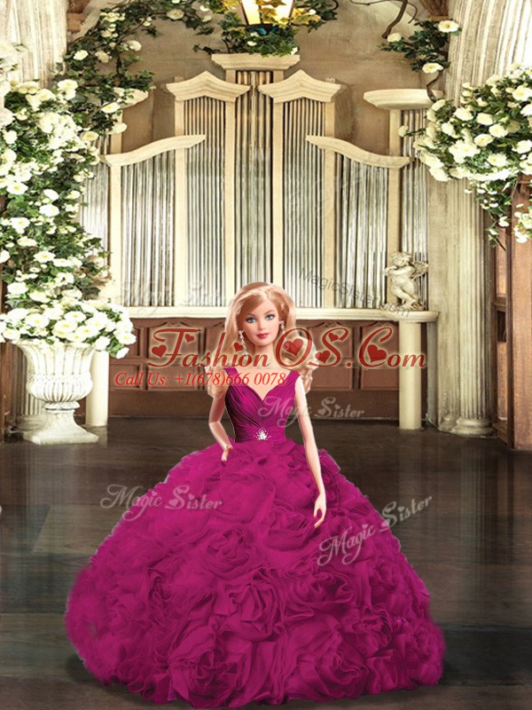 Hot Selling Ball Gowns Sweet 16 Dresses Fuchsia V-neck Fabric With Rolling Flowers Sleeveless Floor Length Backless