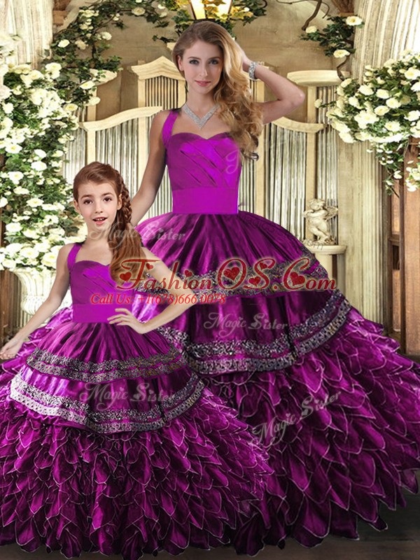 Fuchsia Ball Gowns Organza Halter Top Sleeveless Embroidery and Ruffles Floor Length Lace Up Sweet 16 Quinceanera Dress